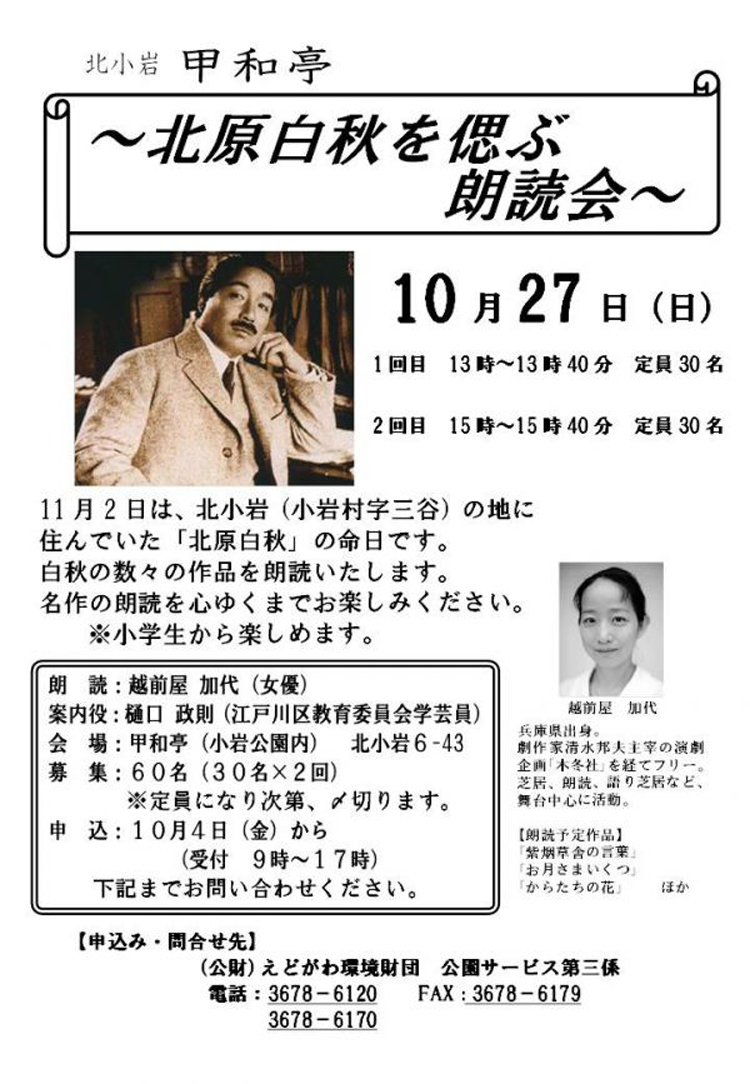 北小岩甲和亭で来る10月27日(日)北原白秋を偲ぶ朗読会が行われます。
