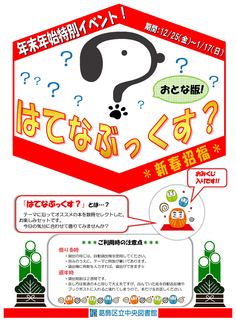中央図書館では、2015年12月25日(金曜日)から2016年1月17日(日曜日)まで「はてなぶっくす?」を貸出いたします。様々なテーマのおすすめの本が数冊セットで包まれています。今年は、おとな版に加え、こども版もご用意!!
