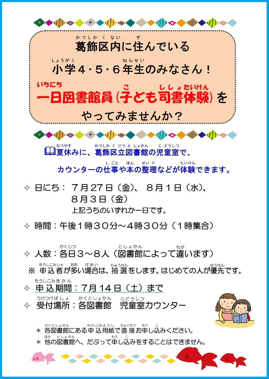 夏休みに葛飾区立図書館の児童室で、カウンターの仕事や本の整理などが体験できます。